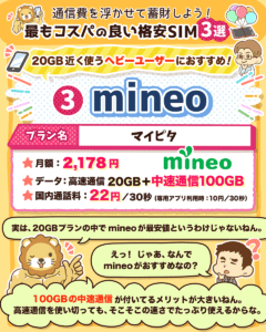 20GBくらい使う人におすすめの格安SIMは、mineoの「マイピタ」というプランです。