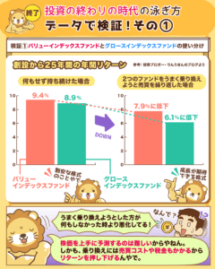 グロースインデックスファンドは8.9% → 6.1%、バリューインデックスファンドは9.4% → 7.9%と、それぞれリターンが低下しました。