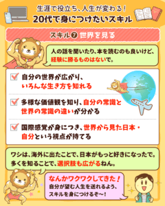 スキルとは少し違いますが、若いうちに世界を見ることも大切です。