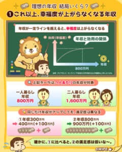 つまり1人暮らしであれば年収800万円ですが、配偶者と2人で暮らしている場合は、年収1,600万円が幸福度の上がりにくいラインになります。