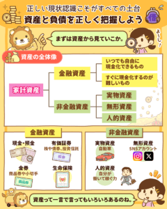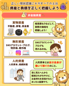 なお、無形資産と人的資産は表に掲載しませんが、どちらも経済的な価値のある資産なので表の外で存在をしっかり認識・把握しておきましょう。
