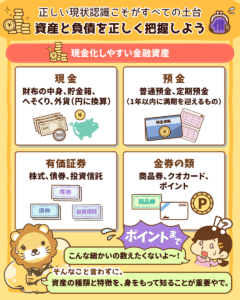 さらに金融資産は「いつでも自由に現金化できる資産」と「すぐに現金化するのが難しい資産」の2つに分類され、以下のようなイメージです。
