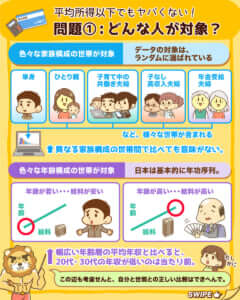 このように、ひとくちに「1世帯あたりの平均所得」といっても、「いろいろな世帯構成」「いろいろな年齢構成」の世帯があります。