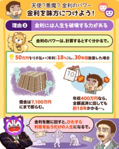 これだけ破壊力のある金利の力は、敵に回せばひたすら利息を払うだけの人生になります。