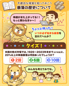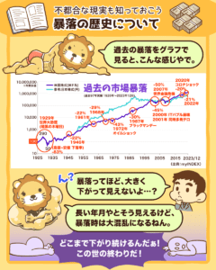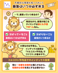 リベ大両学長も暴落のタイミングは予想していませんし、もちろん予想もできないと考えていますが、暴落はいつか必ず起きることを知っています。