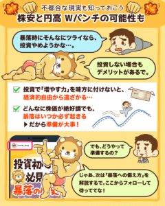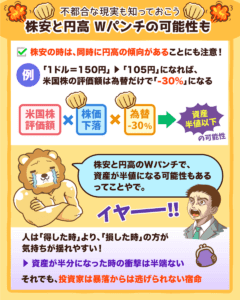 株価下落と為替(円高)のダブルパンチで、みなさんの資産は半値以下になる可能性もあると言えるでしょう。