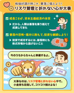 リスク管理と折れない心が重要ということを理解して、株式市場を生き延び、経済的な豊かさを手に入れましょう。