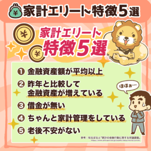 - 金融リテラシーが高く、豊かな家計を築いている「家計エリート」の特徴