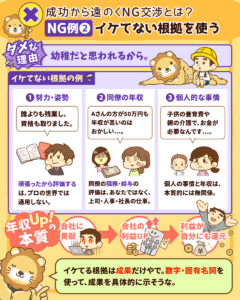 やってはいけない交渉法の2つ目は、センスのない根拠を交渉に使うことです。