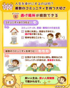 結論から言えば、人生を幸せにするために複数のコミュニティを持つことは大切だとリベ大は考えています。