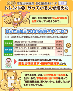 「自分に最も当てはまる投資スタイル」を一つだけ選ぶ設問では、「日本主体:高配当・優待狙いなどの利回り投資」が26%を占めて首位だった。