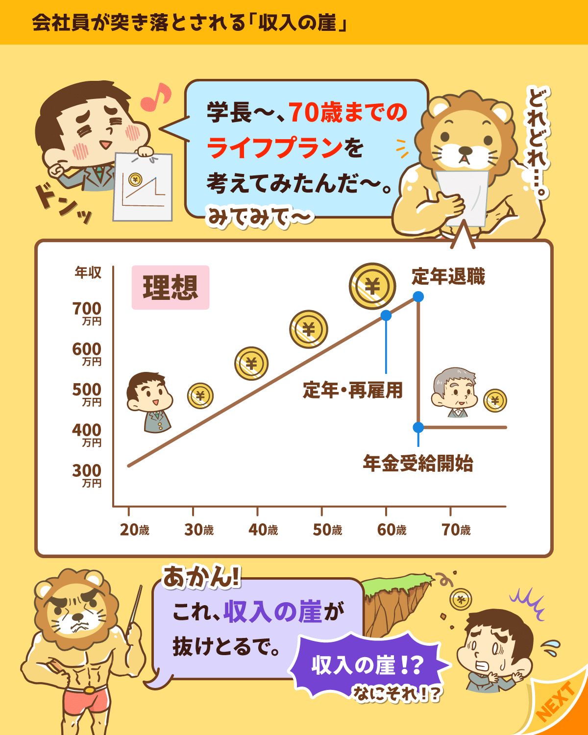 ところが実際には、安泰と思っている会社員の人生設計を狂わせる「収入の崖」という大きなイベントがあるのです。