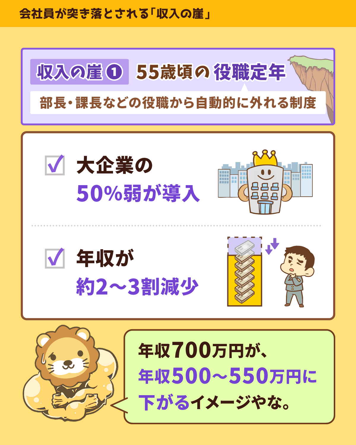 - ①55歳頃の「役職定年」…年収2~3割カット