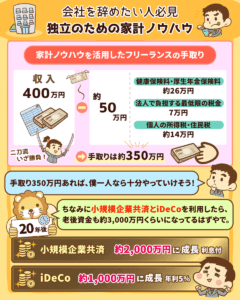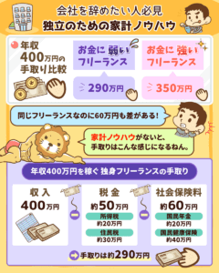 つまり、「お金に強いフリーランス」は、年収400万円に対して350万円を手元に残せるわけです。