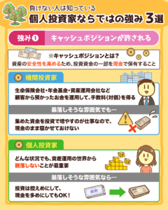個人投資家の1つ目の特権は、「キャッシュポジションが許される」ことです。