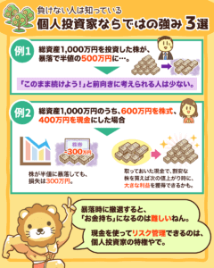 → 安定したメンタルで市場に残れるように、キャッシュを持つことがおすすめです。