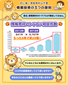 2013年は841件だった情報商材に関する相談件数は、2018年には8,787件に急増しており、たった数年で約10倍です。