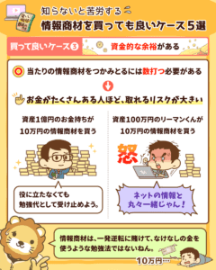 両学長の知人には4,980円の情報商材のおかげで売上が大幅に増えた人もおり、情報商材への苦手意識が原因で売上を伸ばすキッカケを逃すのは、もったいないです。