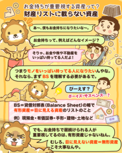 以上見てきたとおり、BSには様々な資産が記載されています。
