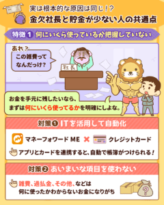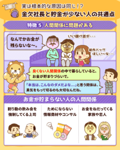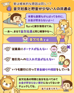 つまり、金欠社長の特徴と貯金が少ない人の特徴は同じ、お金が貯まらない根本原因は一緒なのです。