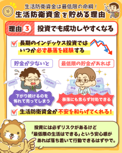 なぜなら、生活防衛資金がない状態で投資をすると、精神的に余裕がなくなり、暴落時に投げ売りに走る可能性があるためです。