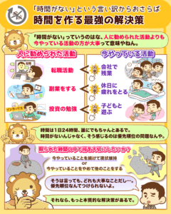 リベ大が勧める副業や投資などを、時間を理由にやっていない人は、「今すでにやっている活動の方が、副業や投資より大事だ!」と、素直に言い換えてください。