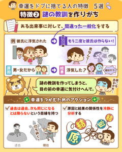 幸運をドブに捨てる人の特徴2つ目は、謎の教訓を作りがちなことです。