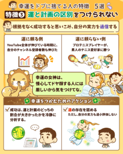 幸運をドブに捨てる人の特徴3つ目は、運と計画(実力)の区別をつけられないことです。