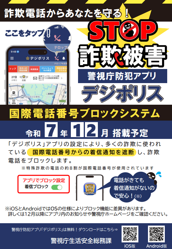 また2025年12月からは、警視庁が作っているデジポリスというアプリを入れておくことで、海外電話からの着信をブロックしてくれるようです。