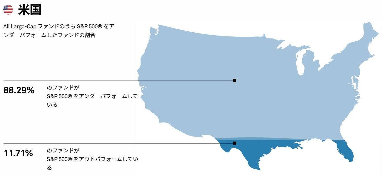 大型株に投資するファンドのうち、S&P500に負けたファンドの割合は88.29%——約9割のアクティブファンドがインデックスファンドに負けているという衝撃の現実が見て取れます。