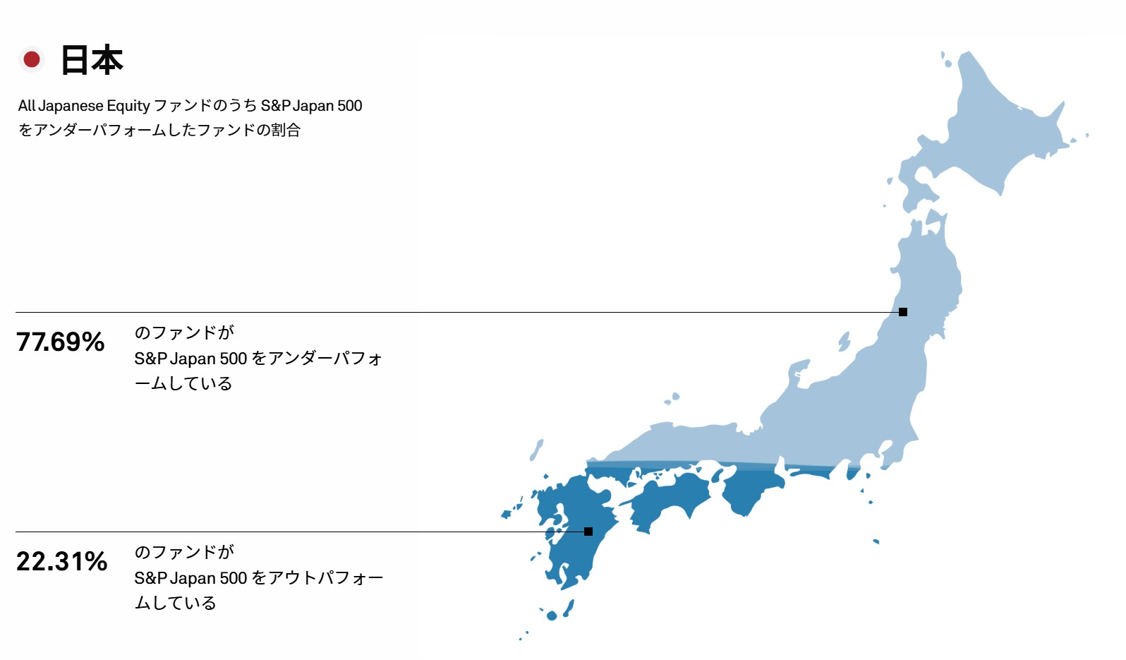 日本で見ると、S&P Japan500に負けたファンドの割合は77.69%。米国よりは健闘しているものの、約8割のアクティブファンドがインデックスに負けている現実です。