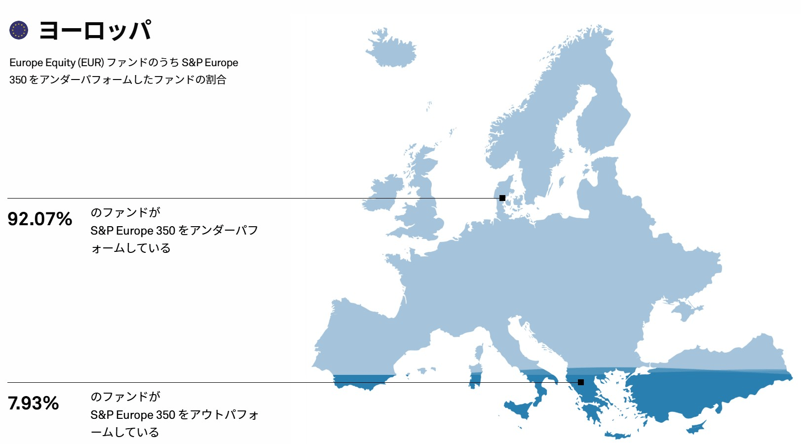 ヨーロッパで「10年間」を指定すると——S&P Europe350(ヨーロッパ版のS&P500のようなインデックス)に負けたファンドの割合は92.07%。実に約9割のアクティブファンドがインデックスに負けています。