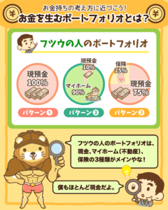 - フツウの人:キャッシュ、マイホーム、保険が中心。