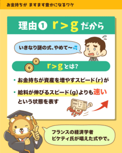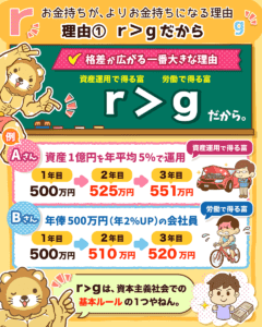 つまり、「資産運用によって得られる富(r)は、労働によって得られる富(g)より大きい」というワケです。