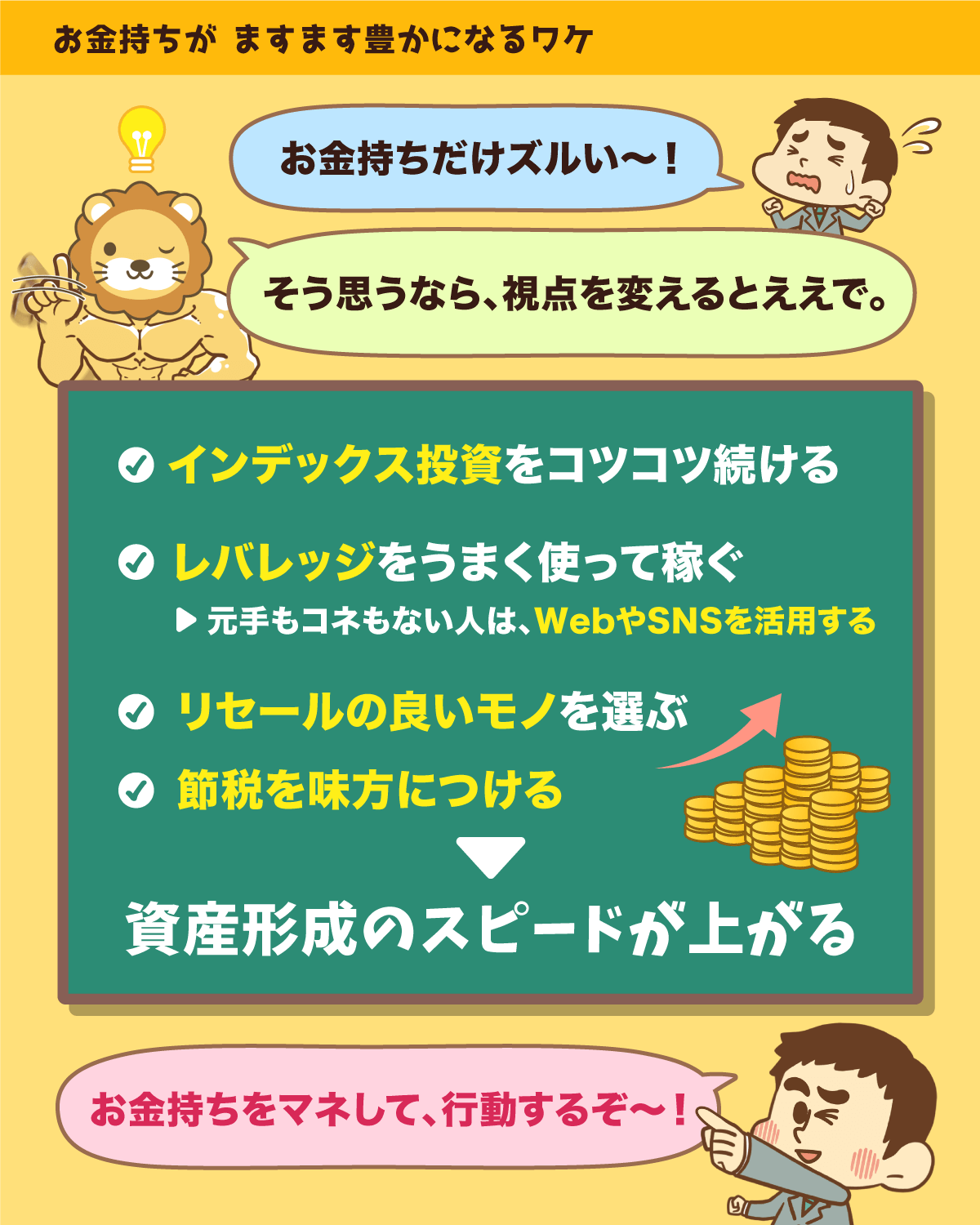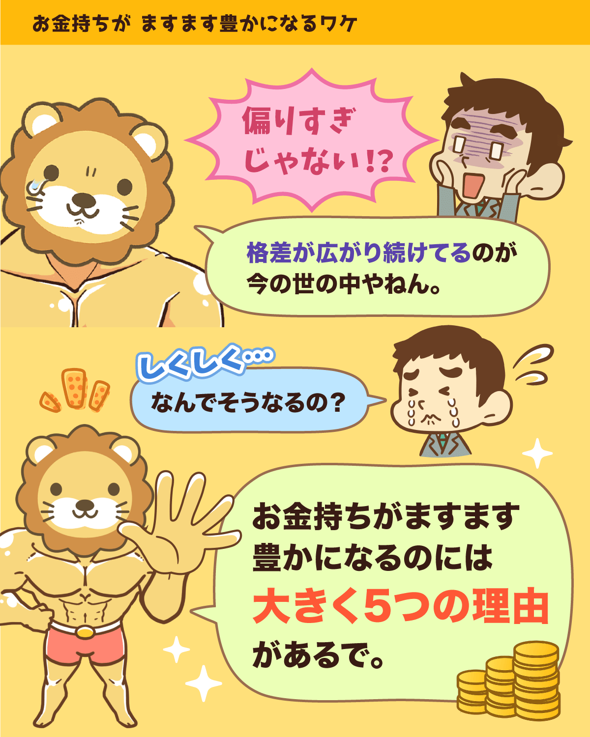 ここまでの話で、「世の中、お金持ちはますますお金持ちになるようにできている」ということは伝わったはずです。