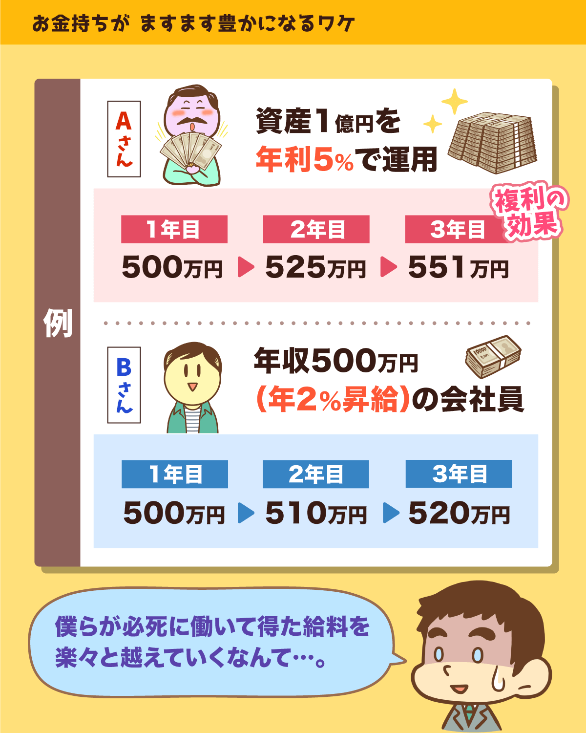 資産運用による収益が500万円 → 525万円 → 551万円と増えていく一方で、労働による年収は500万円 → 510万円 → 520万円というペースでしか増えません。
