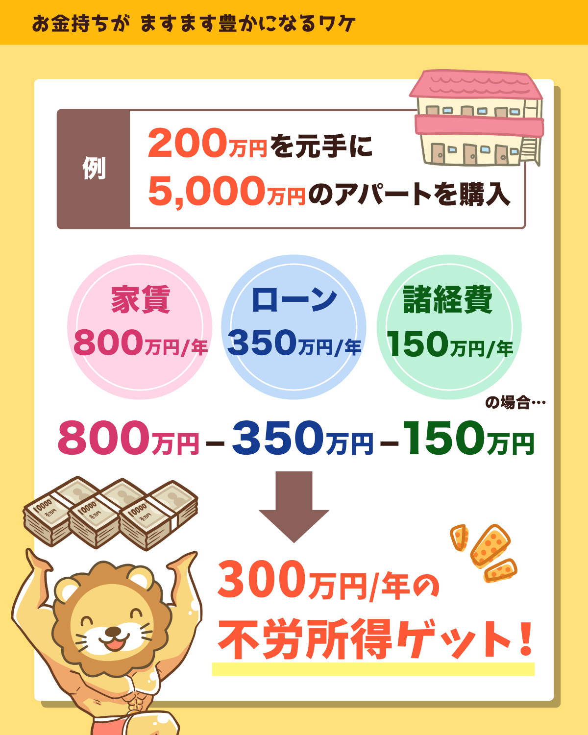 仮に200万円を用意してフルローンを組むことができれば、200万円の持ち出しだけで翌年からは300万円の不労所得が得られるようになります。