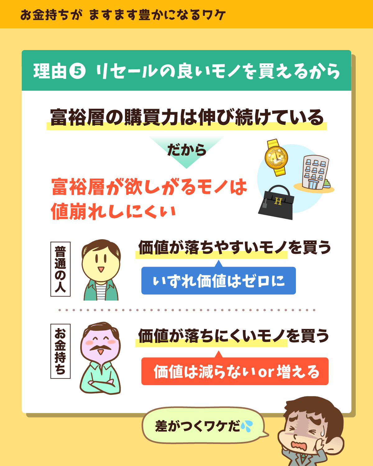 するとこの流れの中で「お金持ちが欲しがるものは、値が下がらない」という自然なストーリーが生まれます。