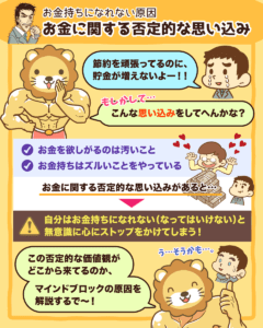 お金に関する否定的な思い込みがあると、「自分はお金持ちになれない(なってはいけない)」というマインドブロックが働きます。