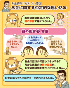 その結果、家庭内の言葉(= 親の言葉)が、皆さんのお金の価値観を作り上げていくのです。