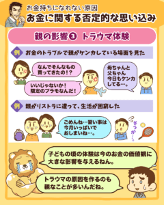 このように、小さなトラウマから大きなトラウマまで、子どもの頃の「体験」は今のお金の価値観に大きな影響を与えます。