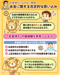 もし、「①親の言葉」「②親の行動(手本)」「③子供の頃のトラウマ的体験」によって、以下のようなマインドになっている場合、お金の価値観を変えなければお金持ちになれません。
