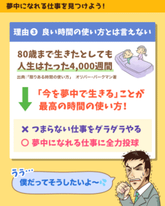 夢中になれない仕事に人生を費やしたり、楽しくない仕事のための終わりなきタイムマネジメントをしたりすることは、もったいない時間の使い方です。