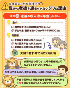 サラリーマンの9割が豊かな老後を迎えられない3つ目の理由は「老後の収入源が年金しかないから」です。