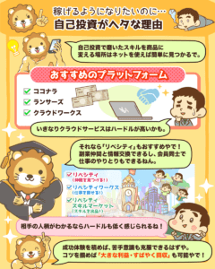 しかし、ココナラのような個人のスキルを売買するプラットフォームを利用すれば「小さな利益・すばやく回収」の成功体験を積みやすいです。