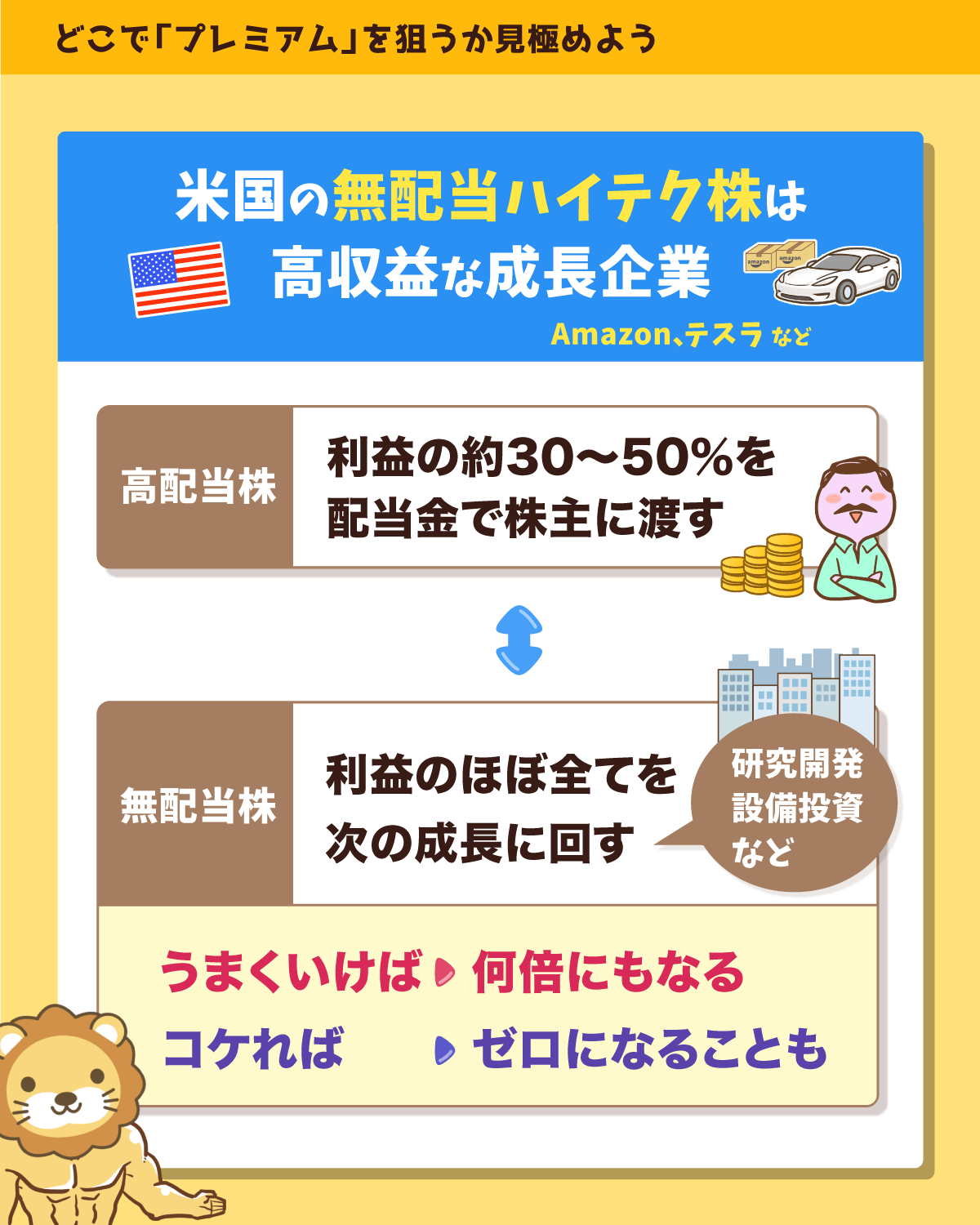 ただし無配当株は、うまくいけば何倍にもなり返ってくるものの、コケると全てが台無しになる可能性もあります。