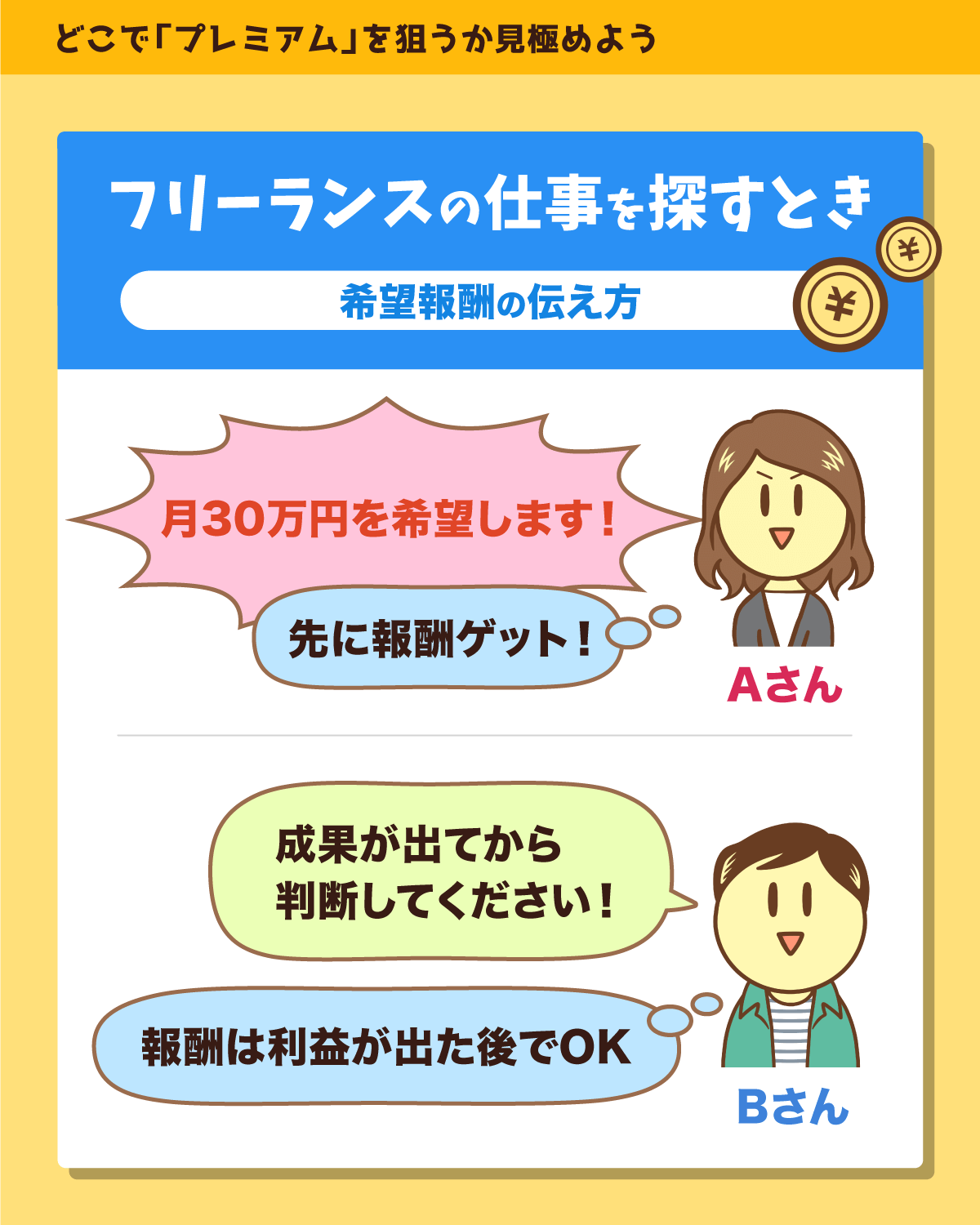 → 「私の報酬は、成果が出てから判断していただければOKです」と言うような人。Bタイプの人は「自分の報酬は最後で良い」と考えている。結果(利益)が出てから報酬を考えてくれたら良いというのは、事業家的なマインドの持ち主。