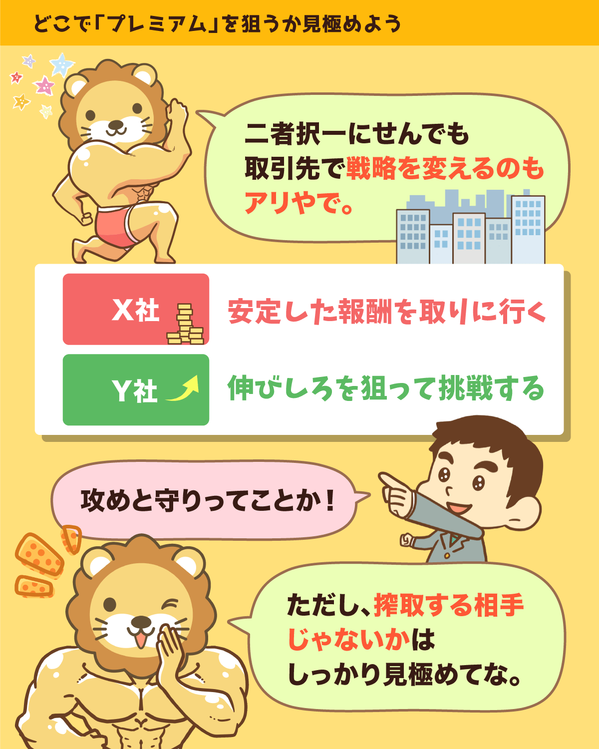 - 取引先Yに対しては、Bタイプで接して報酬の上振れを狙う。