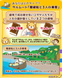 今回紹介する話は「難破船の3人の乗客」という小話ですが、最初にタルムードについて少し補足しておきます。