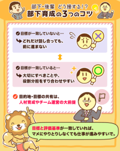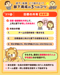 部下・後輩育成のポイント1つ目は「目標の共有(=価値観のすり合わせ)」です。